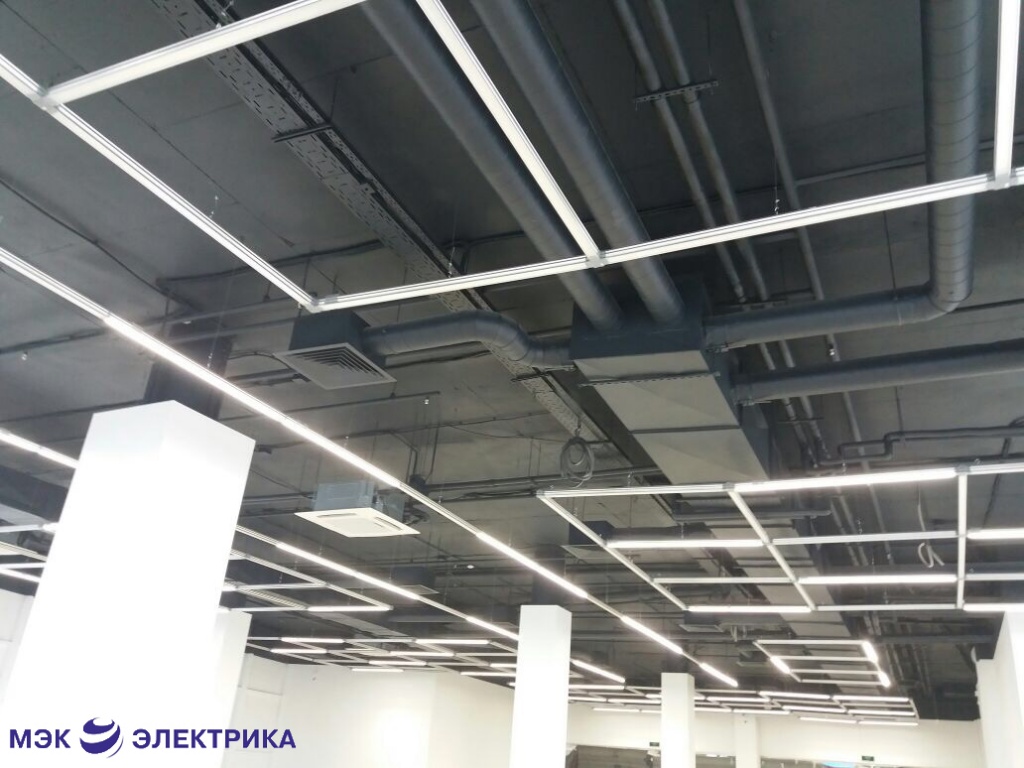 При реализации данного проекта были использованы линейные полутораметровые светодиодные светильники LEDEL L-trade 55 с цветовой температурой 5000К и муляжи данных светильников. Линейки подвесных светильников чередуясь с муляжами складывались между собой в 8 независимых друг от друга фигур, образуя сложный световой узор. Это позволило подчеркнуть особенности организации торгового пространства неправильной формы с колоннами-опорами посреди зала и лофтовый дизайн потолка.