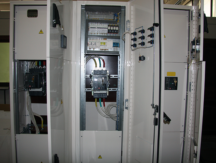ГРЩ выполнен на выкатных автоматических выключателях Schneider Electric NSX400F с моторным приводом, с секционным АВР на контроллере Zelio Logic и с многофункциональными измерительными приборами типа РМ710. Использование компонентов Schneider Electric позволило обеспечить высочайшую надежность и отличные эксплуатационные характеристики изделия.